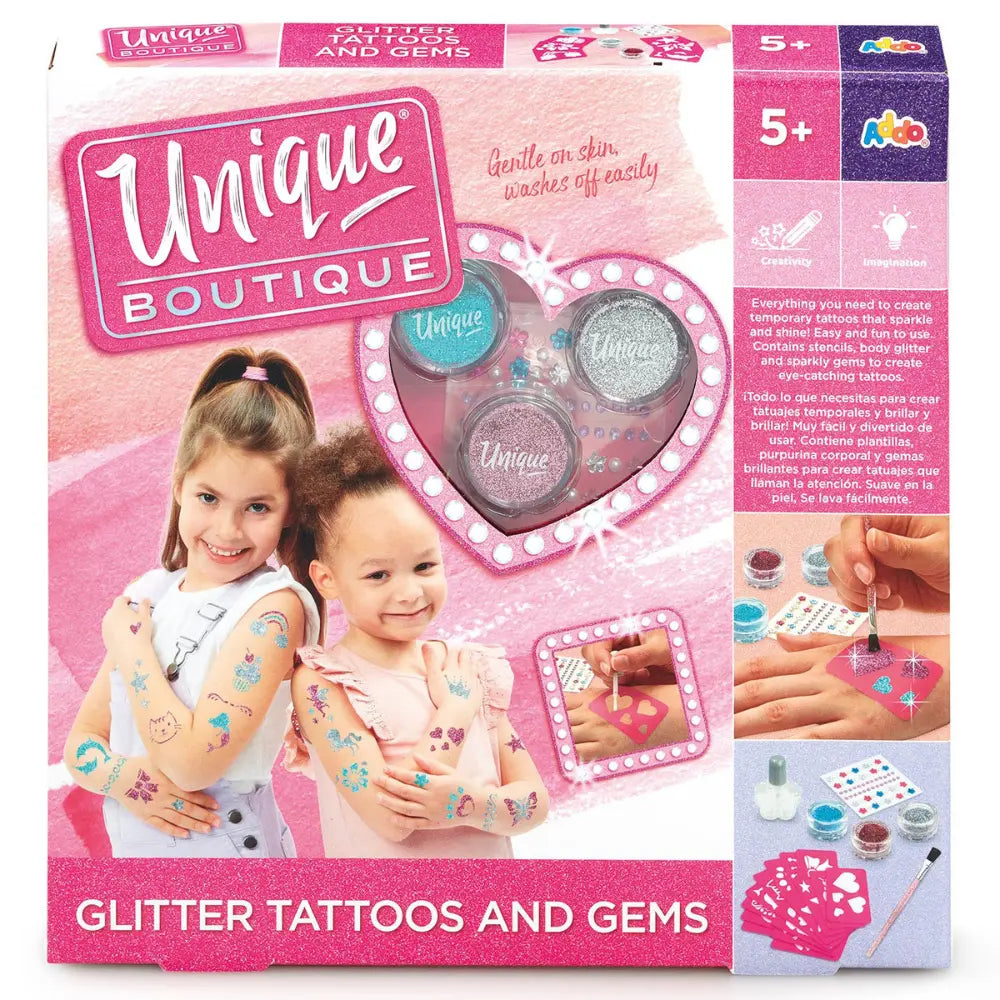 اصنعي وشومًا مؤقتة تتلألأ وتتألق مع مجموعة Unique Boutique Glitter Tattoos and Gems من Addo. سهلة الاستخدام وممتعة، ما عليك سوى اختيار التصميم من أوراق الاستنسل، وضع لاصق الجسم التجميلي، ثم توزيع البودرة اللامعة على الجسم، وأضف اللمسات النهائية بالأحجار البراقة.