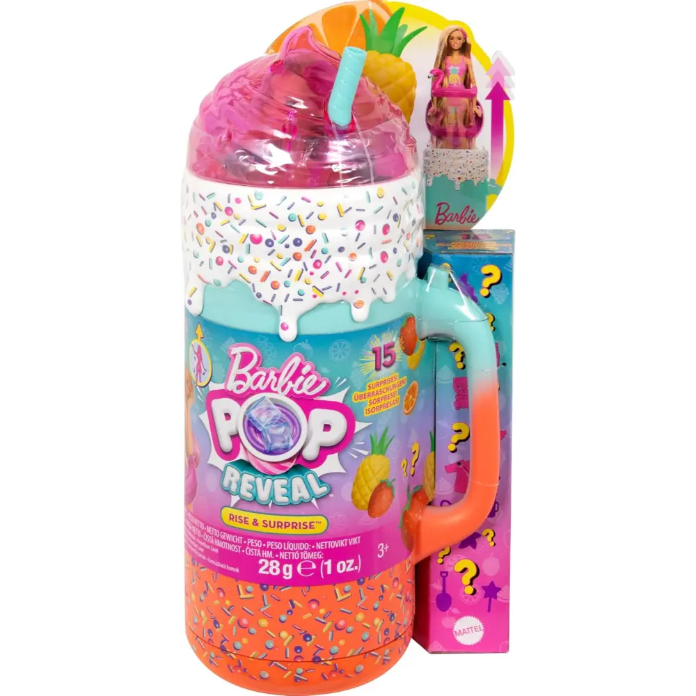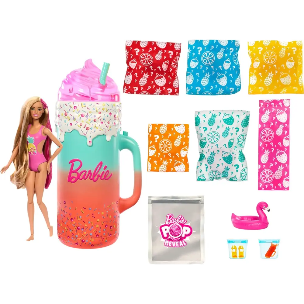 استعد لموجة من المفاجآت مع باربي Pop Reveal Rise and Surprise – سلسلة الفواكه! تتضمن هذه المجموعة الممتعة أكثر من 15 مفاجأة صُممت لإشعال الخيال والإبداع لدى الأطفال. اضغط على الزر لمشاهدة باربي ترتفع سحرًا من الكوب! ترتدي باربي زي سباحة ملون مستوحى من الفواكه، مع شعر أشقر مخطط بالوردي، وماكياج للوجه يتغير لونه عند استخدام الماء الدافئ أو البارد. ستكتشف أيضًا المزيد من المفاجآت مثل حيوان أليف معطر قابل للعصر، مكعبات ثلج قابلة لإعادة الاستخدام تحتوي على أحذية وإكسسوارات مخفية، رمل قابل للتشكيل، وقطع مستوحاة من الشاطئ لتجربة لعب إبداعية لا نهاية لها.