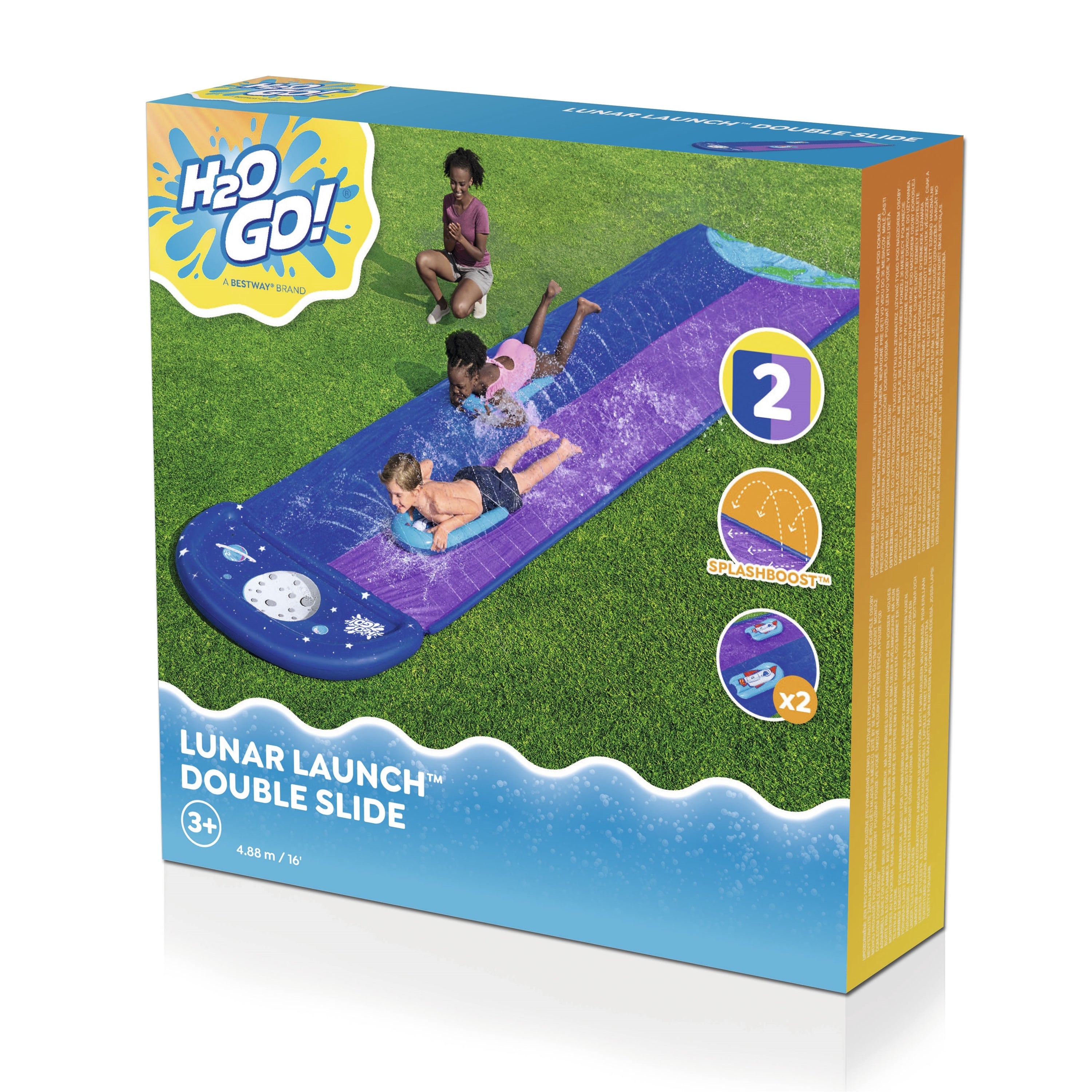 Bring exciting summer water fun to your backyard with the Bestway H2Ogo Slide Lunar Launch 488 cm! This inflatable water slide features a vibrant cosmic design and two parallel lanes that are perfect for racing and entertaining kids. Simply attach a garden hose to the built‑in SplashBoost™ sprinklers to keep both lanes slick and ready for fast, wet slides. Riders zoom toward a splash pool at the finish line, making it a hit for playdates, parties, and outdoor fun. Easy setup means more time enjoying summer memories!