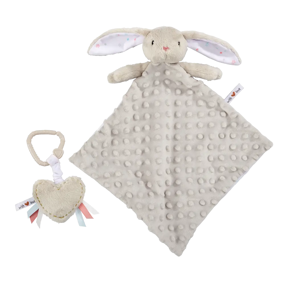 تمنح هذه المجموعة الساحرة الأطفال الجدد وسادة مريحة وملمساً لطيفاً أثناء نموهم. تتضمن البطانية أرنب محشو بلون رمادي ناعم، بالإضافة إلى صافرة على شكل قلب يمكن تعليقها على سرير الطفل أو عربة الأطفال.