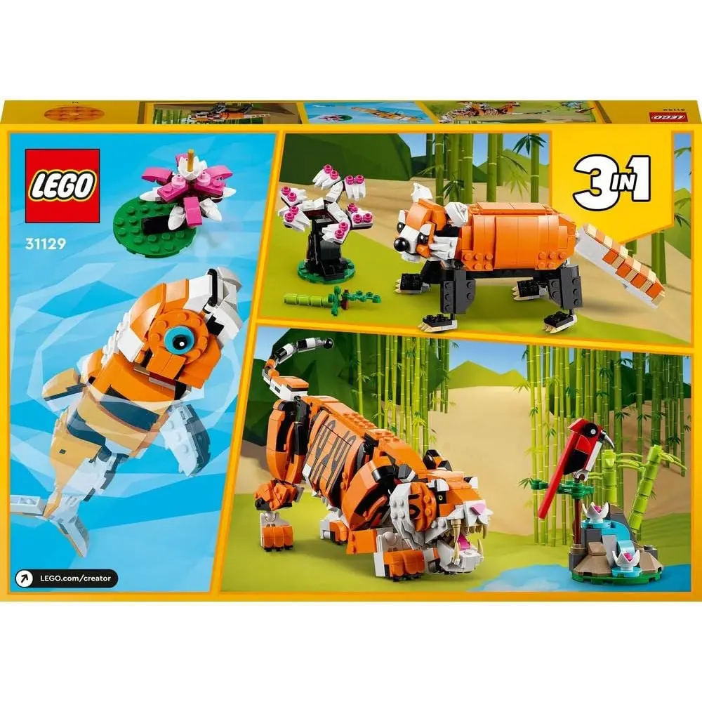 سيحب عشاق الحيوانات من عمر 9 سنوات فما فوق تمثيل قصص ممتعة مع LEGO® Creator 3in1 Majestic Tiger – 31129. يتميز هذا الطقم بنموذج نمر مبني من الطوب مع ذيل، أرجل، جسم، أكتاف، رأس وفك متحرك، ويمكنه أيضًا تغيير تعابير وجهه.