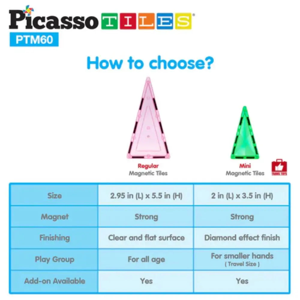 تتميز مجموعة مكعبات البناء المغناطيسية – السلسلة الصغيرة (MINI) باحتوائها على 60 قطعة بحجم مناسب للسفر وسهل الحمل، مع سطح فريد بتصميم على شكل ألماس. يمكن استخدام المجموعة بشكل مستقل أو مع مجموعات بيكاسو تايلز MINI الأخرى كقطع إضافية متكاملة، مما يوفر إمكانيات مفتوحة لبناء أشكال وهياكل متنوعة تساعد على تنمية إبداع الأطفال وتعزيز ذكائهم.