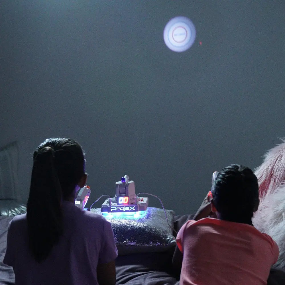 عندما تُطفأ الأنوار، تبدأ اللعبة مع Projex Animated Projecting Game Arcade! لا تحتاج إلى شاشة تلفاز أو مستشعرات، فقط وجه جهاز ProjeX نحو حائط فارغ، امسك البلاستر، صوّب، وأطلق النار على الأهداف!