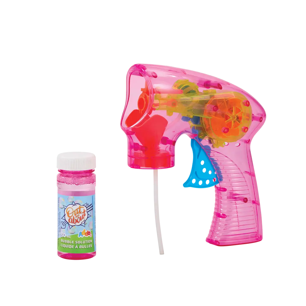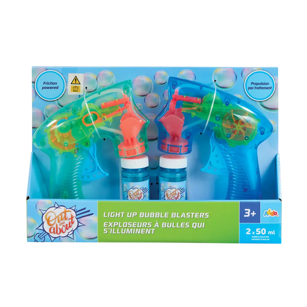 Bring sparkle and excitement to outdoor play with the Out and About Light Up Bubble Blasters. Featuring a friction-powered design, these blasters require no batteries—just pull the trigger to release a stream of shimmering bubbles. The built-in light-up feature adds an extra touch of magic, especially during evening play. Perfect for parties, playdates, or sunny afternoons in the garden, this set includes two bubble blasters and bubble solution for instant fun. Lightweight and durable, they’re ideal for little hands to hold and operate with ease. Suitable for children aged 3 years and above.