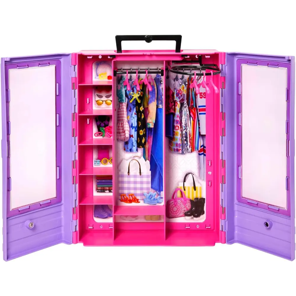 Take fashion on the go with the Barbie Ultimate Closet—a stylish portable wardrobe packed with endless storytelling possibilities. Designed with Barbie’s signature pink style, this fashionable closet features clear double doors for a glimpse inside. Open it up to reveal a well-organized space filled with trendy outfits and fun accessories. The set includes a Barbie doll dressed in a floral romper and shoes, plus two additional dresses and mix-and-match pieces. With a convenient carrying handle, kids can easily bring their fashion fun wherever they go. Perfect for playtime at home or on the move, this closet inspires creativity and imaginative role-play.