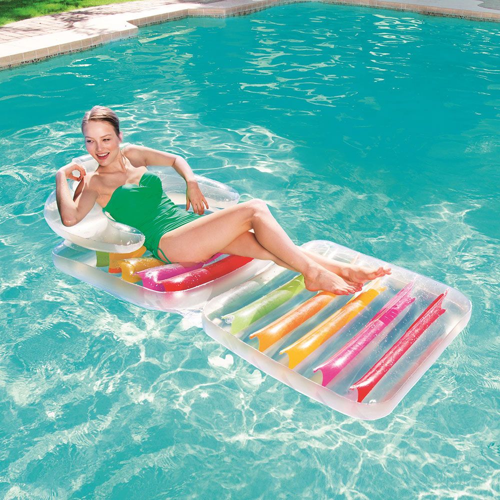 HIGH FASHION FOLDING LOUNGE CHAIR* Safety valves* Sturdy pre-tested vinyl* Transparent top with multi colored I-beam construction* 3 air chambers* Convenient folding design* Converts from chair to lounge in seconds* Back, head and arm rests for maximum comfort* Repair patch includedContents: One lounge, repair patch