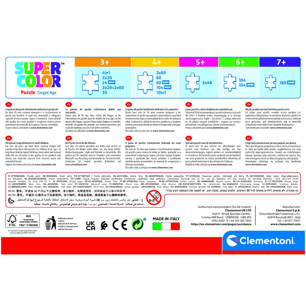 3 puzzles with 48 puzzle pieces. Measure for finished puzzles: 21 x 20.5 cm. A vast array of jigsaw puzzles specially designed for kids to help them hone their powers of observation as well as their logical and manual skills. Captivating images with vibrant appealing colours, depicting childrens most beloved characters for hours of fun with friends and family. Acutely attuned to the importance of environmental awareness, Clementoni makes extensive use of recycled materials and avoids any components containing pollutants. Made in Italy. Visit Clementoni support section to benefit from the ï؟½lost piecesï؟½ service.