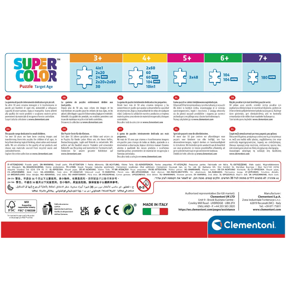 Childrens jigsaw puzzle with 104 pieces. Size of completed jigsaw puzzle: 27 x 38 cm. A wide range of puzzles entirely dedicated to the little ones to help them develop observation, logic and dexterity skills. Engaging images with bright and sparkling colors, depicting the characters most loved by children, to have fun with friends and family. Clementoni has always been sensitive to the problem of ecology and uses a lot of recycled materials, avoiding the use of polluting components. Made in Italy.