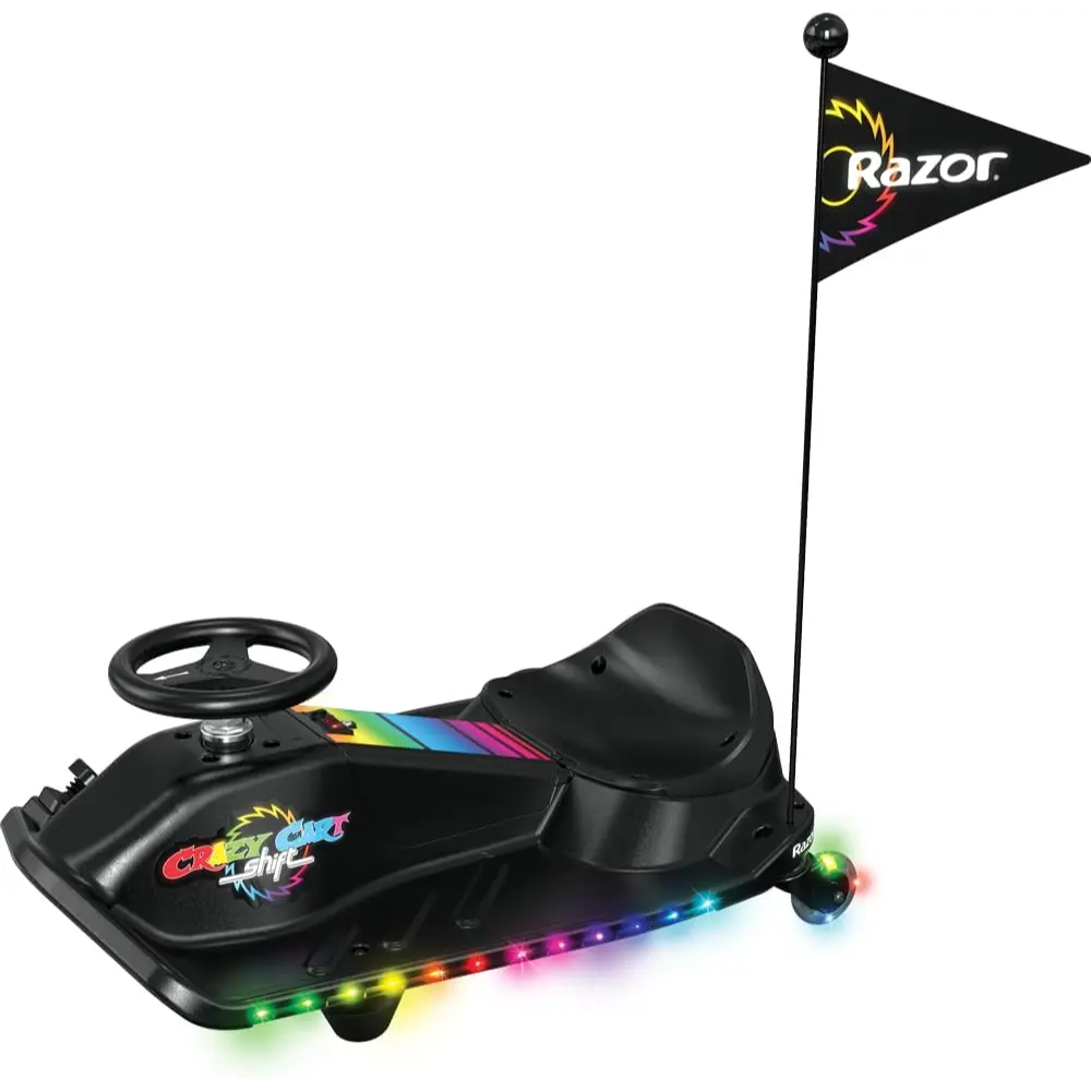 The all-new Crazy Cart® Shift™ Lightshow brings the excitement of drifting and driving to kids as young as six. Designed with a smaller, lighter frame, this electric go-kart features a simplified drift system that lets young riders experience the thrill of spins and slides safely. The Parent-controlled Top Speed Switch lets you set the perfect speed for your child — 8 mph (13 km/h) in “HIGH” mode or a safe 2.5 mph (4 km/h) in “LOW” mode. Multi-colored LED lights along the sides and rear caster wheels light up as the cart moves, adding a dazzling visual experience to the fun. Powered by a maintenance-free Power Core™ Hub Motor, the Crazy Cart Shift ensures smooth acceleration without the hassle of chains or sprockets. Up to 40 minutes of continuous use in HIGH mode and up to 80 minutes in LOW mode make it perfect for hours of play.