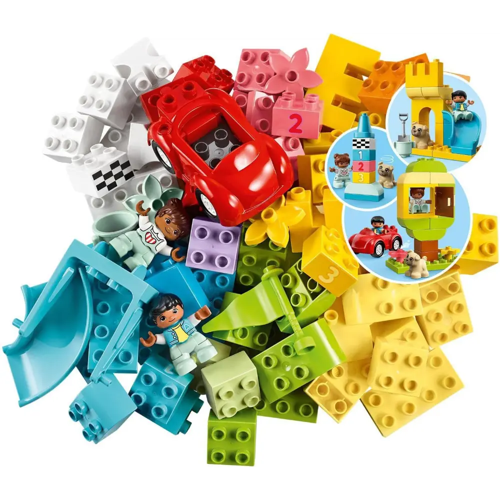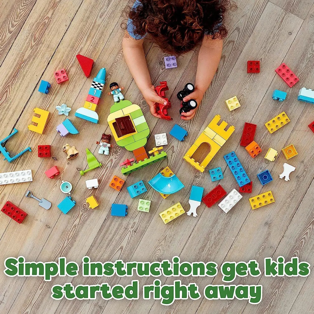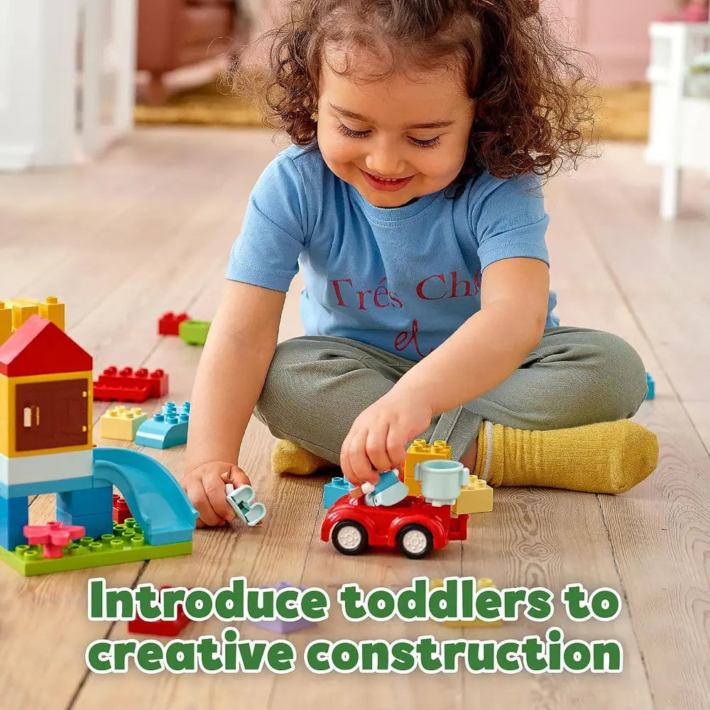 The colourful ricks and special pieces in the LEGO® DUPLO® Deluxe Brick Box playset were designed to inspire endless creativity and help with a number of developmental benefits for your child. This preschool LEGO building toy hash its own storage box! Inside the sturdy toy box, you'll find inspiration and ideas to engage and excite young minds. There's a car, windows, flowers, balloons, gifts and a cake; bricks labelled 1 to 5 for number play. As parents and carers join in connecting the bricks and pieces to make imaginative models, they share precious developmental milestones with their little builders. This educational building toy makes the ideal gift for toddlers aged 18 months and up. With colorful, easy-to-hold pieces that excite imaginations and encourage open-ended play, they put creative control right into the hands of preschool kids.
