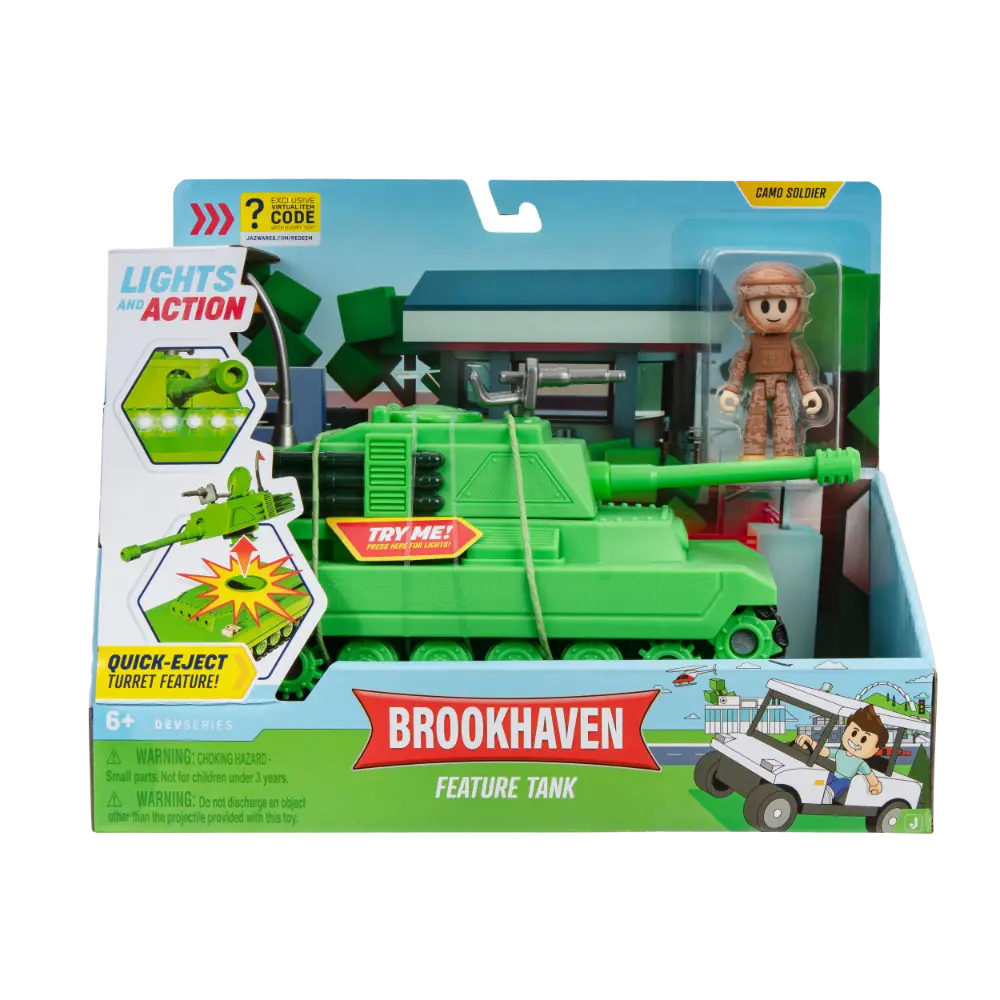 Barrel down the block with the Brookhaven Feature Tank. Featuring working tank treads and a rotating turret cannon, this 7.5-inch vehicle is ready to patrol the neighborhood. It also includes a 2.75-inch mix-and-match figure of Camo Soldier to drive the tank and, when things get really wild, the turret can eject on demand. Pack also includes a special Collectors Checklist as well as an Exclusive Virtual Item Code that unlocks a Tank Hat for your avatar.