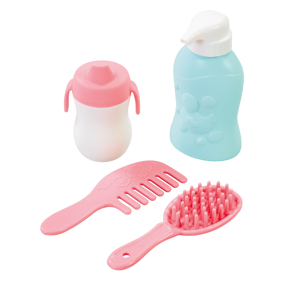 In the beautiful fabric bag, you will find a changing mat, nappies and lots of accessoriese to care for baby when out and about. Use the changing mat, wipe box and lotion to clean up any messes. You can brush and comb their hair then feed them – its fun playing pretend.