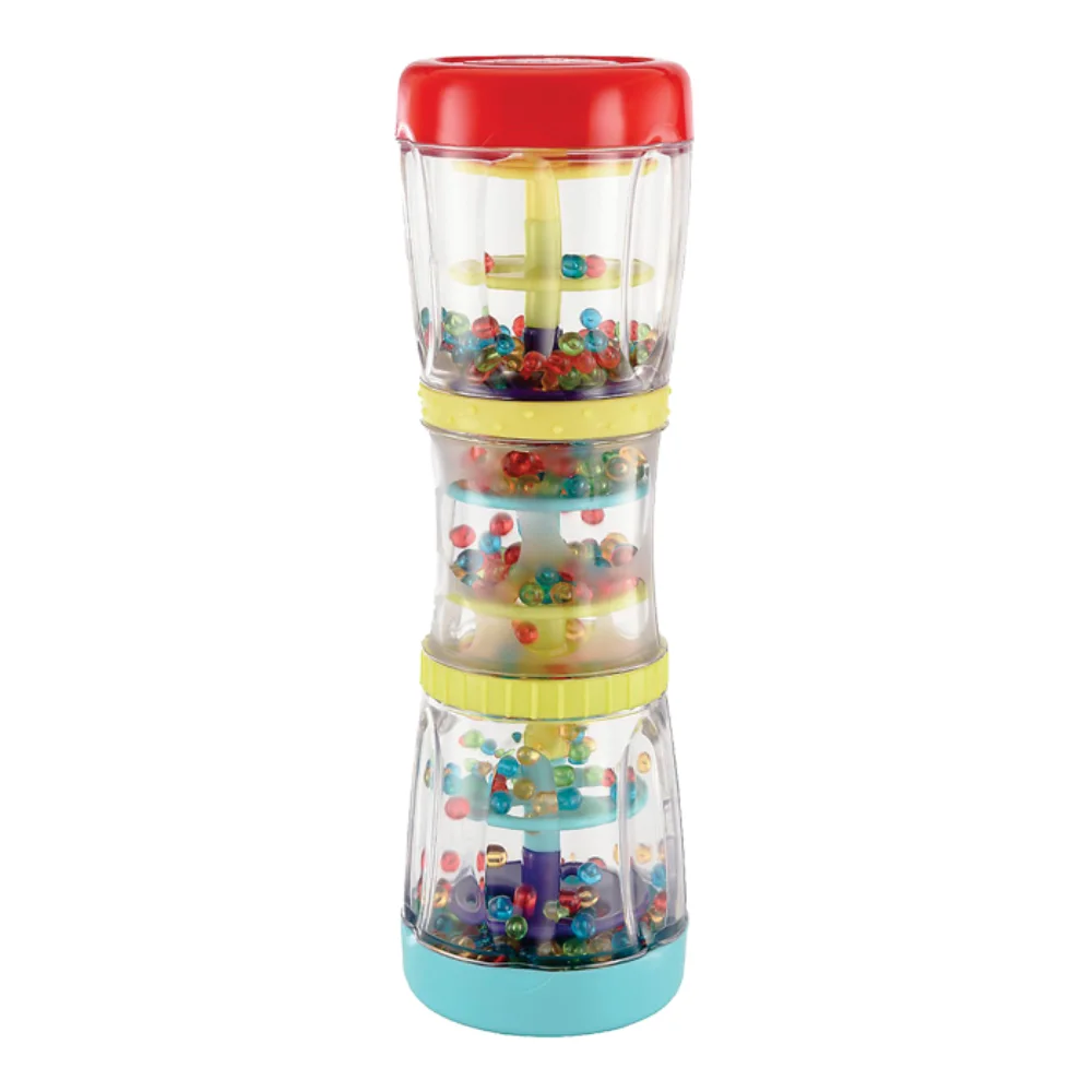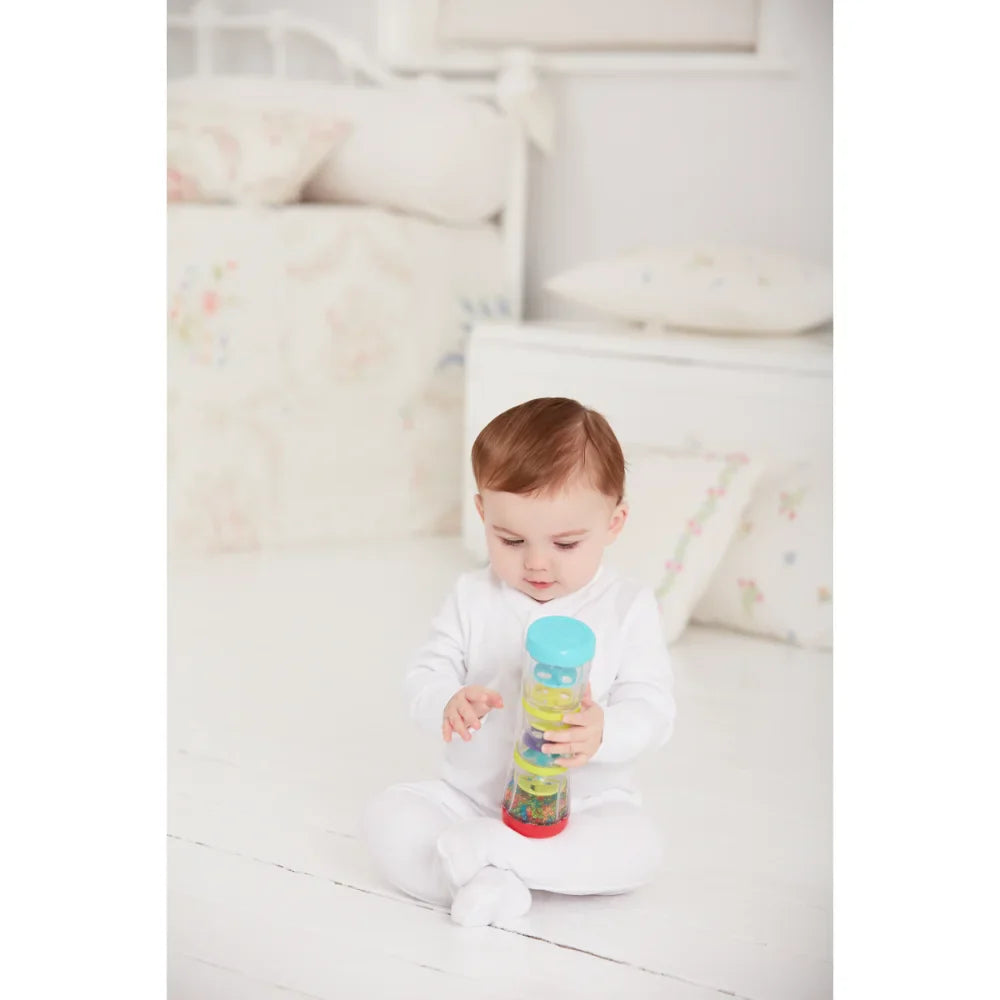 This delightful toy is so mesmerising! Turn, twist and shake it to hear amazing rain-like sounds as the beads tumble around. Baby will love watching the colours dance and bounce inside.This easy-to-use Rainmaker toy has been specially designed for little hands and stimulates senses while developing hand to eye coordination.