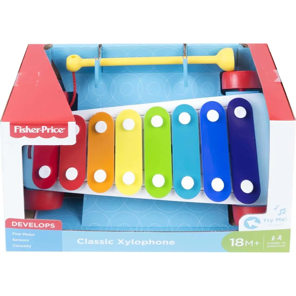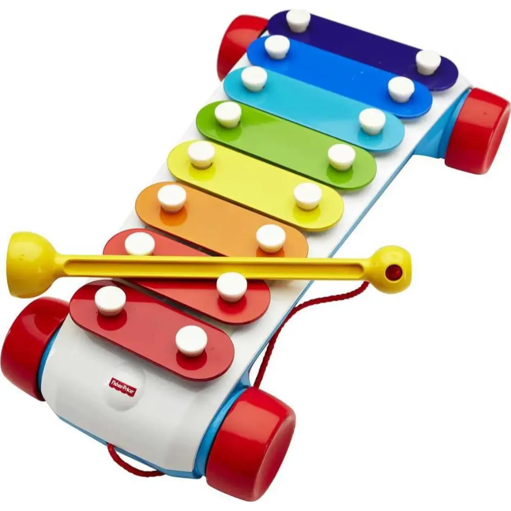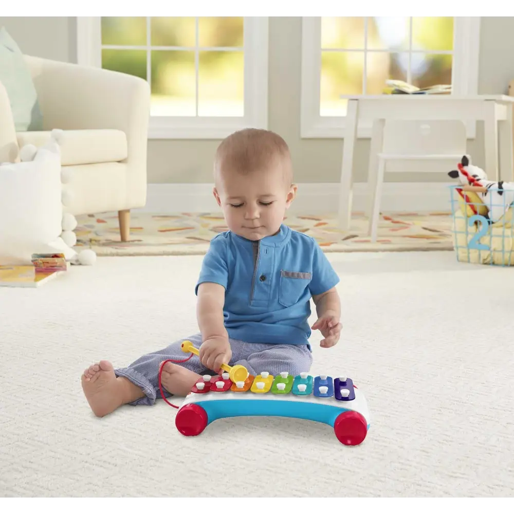 Introduce your baby to the joy of music with this classic Xylophone pull toy! Featuring eight colorful keys and a tethered mallet, it encourages early musical exploration while developing hand-eye coordination. Toddlers can tap the keys to create melodies and pull the toy along with the easy-rolling wheels and attached string for on-the-go fun. Bright colors and cheerful sounds stimulate your child’s senses, making this toy perfect for infants and toddlers aged 18 months and up.