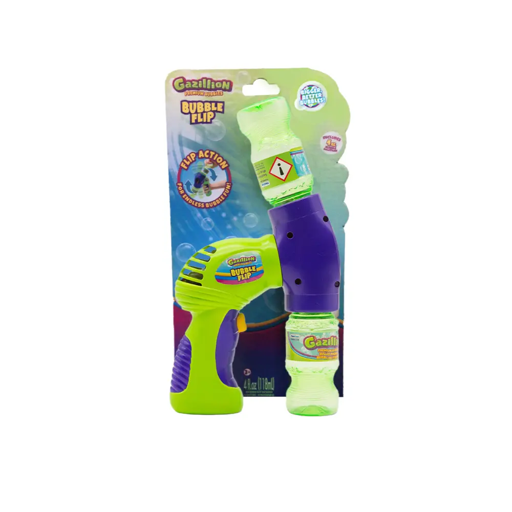 Get ready for double the bubble fun with the Gazillion Bubbles Bubble Flip! This clever blaster creates a non-stop stream of bubbles with its unique flip-action design. Simply twist in the 4oz Gazillion Bubbles Solution bottle, pull the trigger, and watch the bubbles fly! When the bottle’s empty, flip the front part, use the bottle as a handle, and keep the fun going. Perfect for outdoor play and parties, this toy guarantees hours of bubbly excitement for kids aged 3 and up.