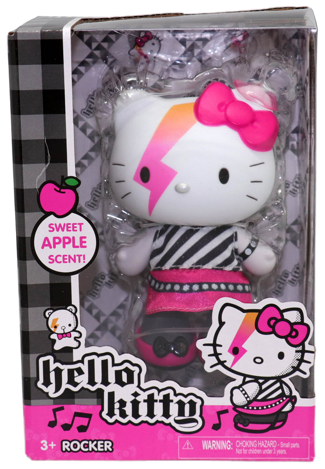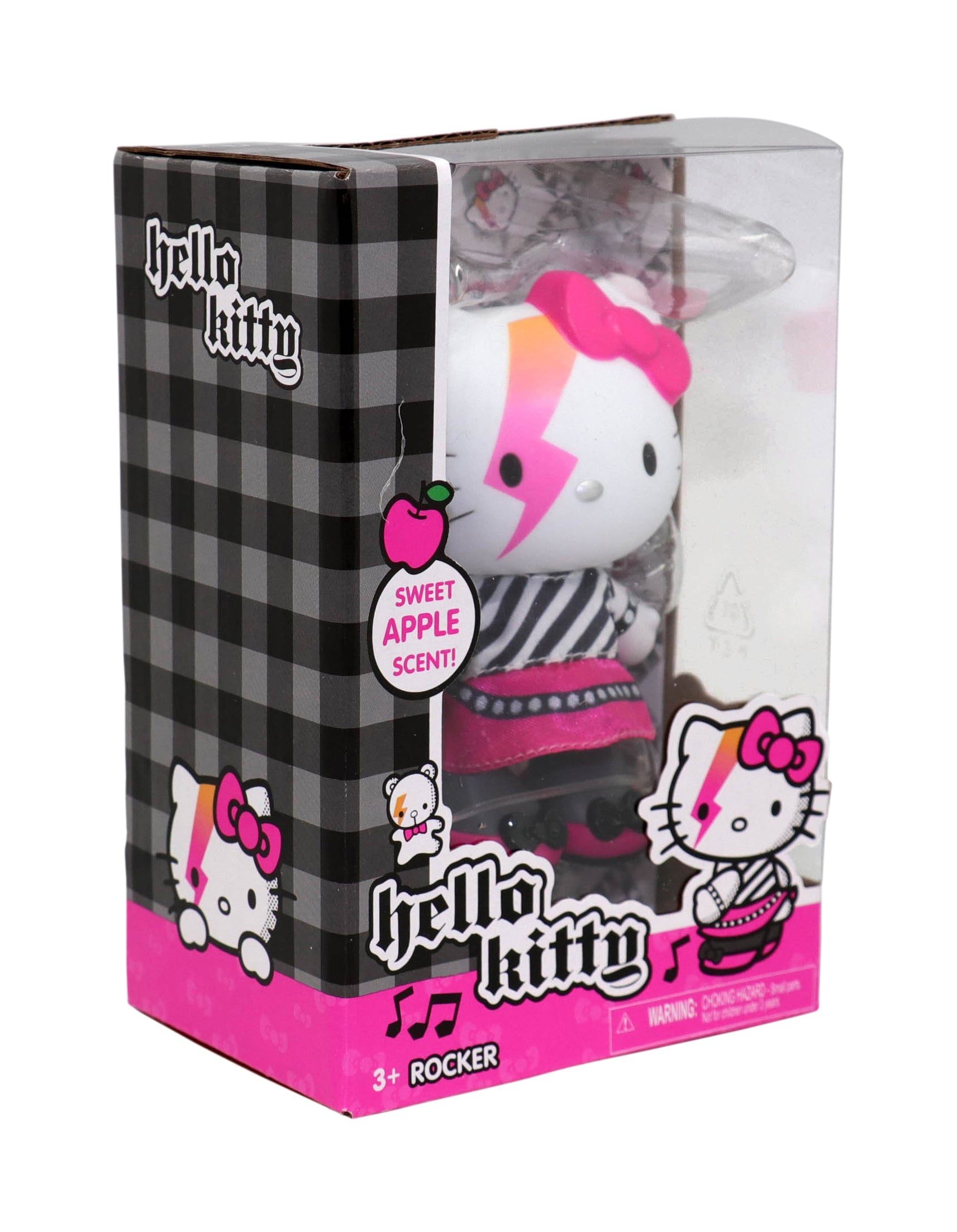 Rock out with the Hello Kitty Rocker Figure, a stylish collectible toy perfect for Hello Kitty fans of all ages. This figure showcases Hello Kitty in a bold rocker-inspired outfit featuring a black and white striped top, a pink skirt, and her iconic pink bow. Highlighted by unique lightning bolt face paint and infused with a sweet apple scent, this figure offers both visual appeal and a fun sensory experience. Ideal for display or imaginative play, it’s a must-have addition to any Hello Kitty collection.
