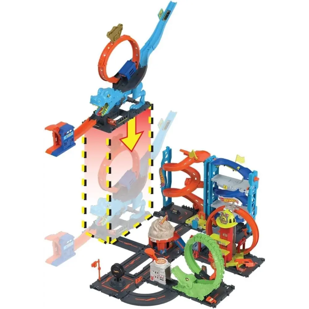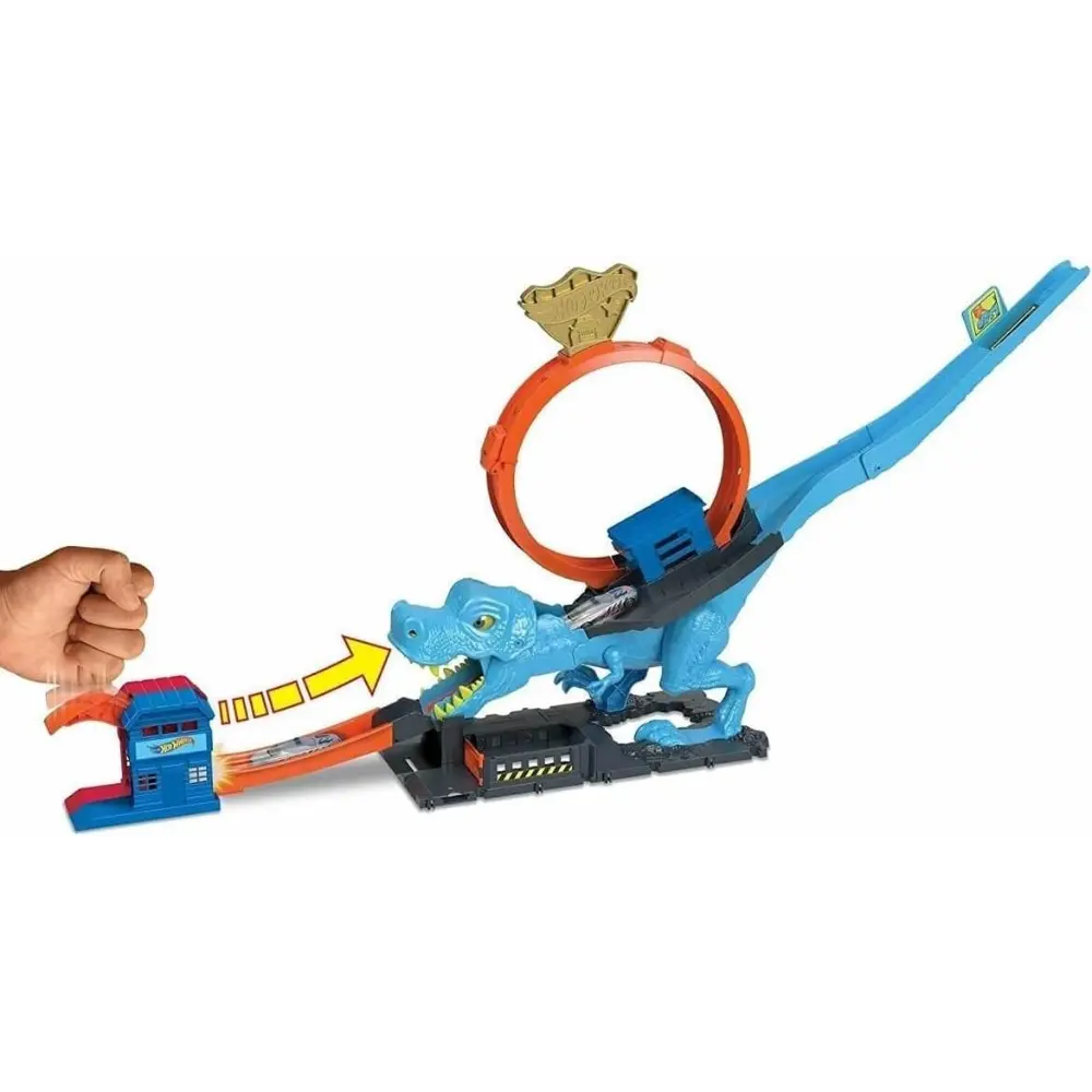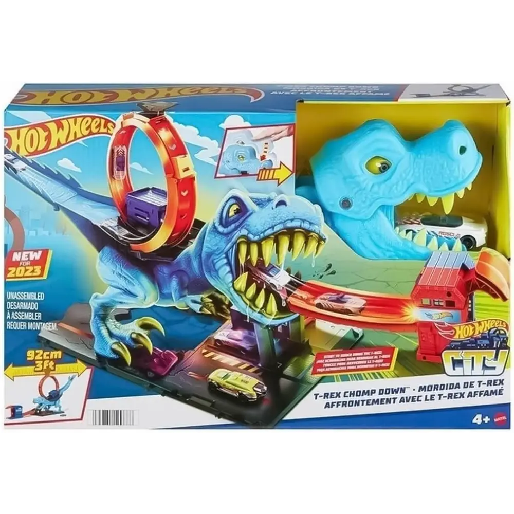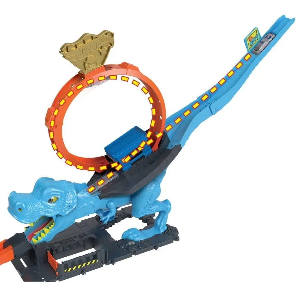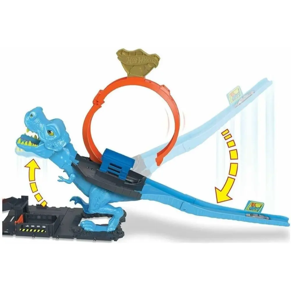 Take on the ultimate dinosaur challenge with the Hot Wheels City T-Rex Chomp-Down Playset! Kids can launch their Hot Wheels cars through a slam launcher and 9-inch loop to knock out the massive T-Rex and save the city. When the dino is defeated, its eyes change from angry yellow to knockout X-es for added excitement. The set includes one 1:64 scale Hot Wheels vehicle and features police-station-themed track details that inspire imaginative storytelling. Connect with other Hot Wheels City sets (sold separately) for extended play. Suitable for kids 4 years and up. Colors and decorations may vary.