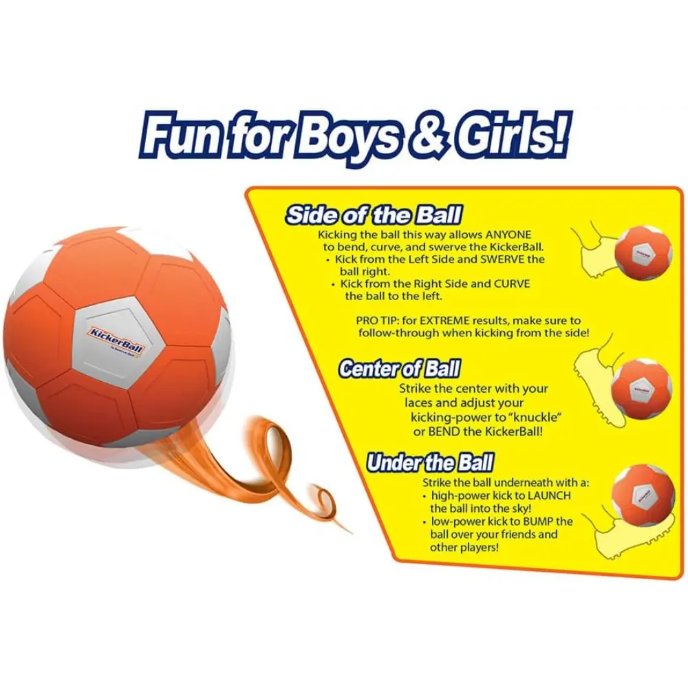 Inspired by the worlds greatest athletes, our special patent-pending product designcombines unique paneling and aerodynamic materials that together channel air di erently than your standard soccer ball. Our KickerBall gives you the ability to SWERVE, BEND, andCURVE with ease! Created for kids, adults, or ANYONE who wants to learn cool tricks; theKickerBall will be your next favorite toy. (Please Note: The KickerBall is not a FIFA,NFHS orNCAA certifed soccer ball.