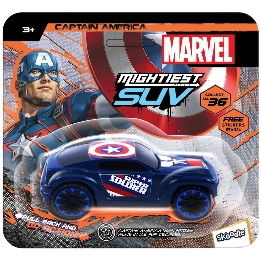 Dynamic and entertaining, our pull-back Marvel SUV promise high-speed fun at your fingertips. Simply pull them back, release, and watch as they zoom forward, thrilling both kids and adults with their speedy antics. Compact, colourful, and built for excitement, these Marvel SUV are a must-have for endless playtime joy. Your Captain America figure will be way too fast for his enemies to handle on this incredible crime-fighting.