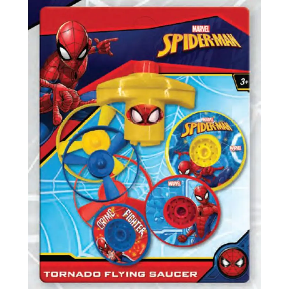 The Tornado Flying Saucer features six colourful discs, 3pcs discs and 3pcs propeller. The discs with an image of your favorite Spiderman character. Simply load a discs or either propeller on to the launcher, spin the top and watch as the dics or propeller flies off towards its target.