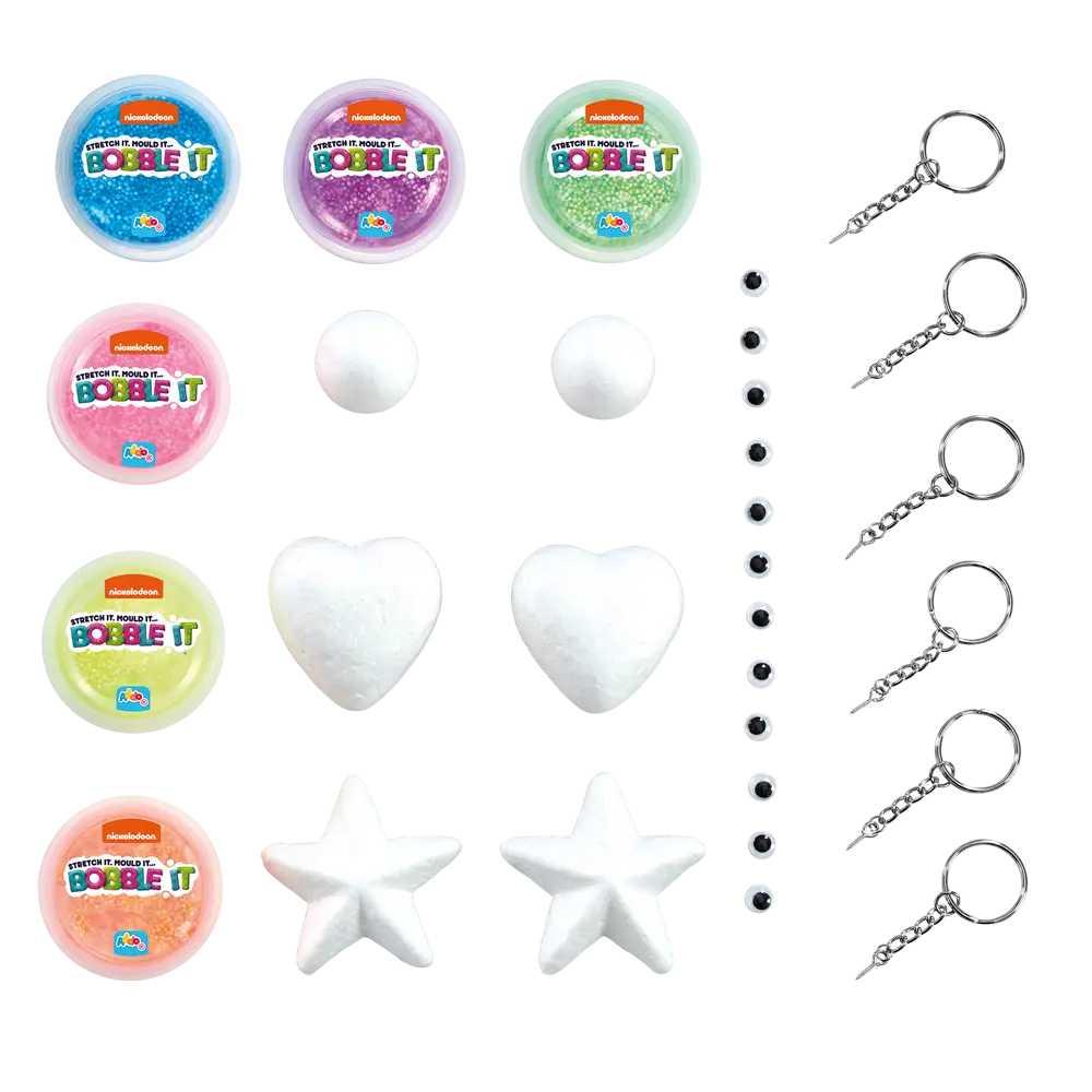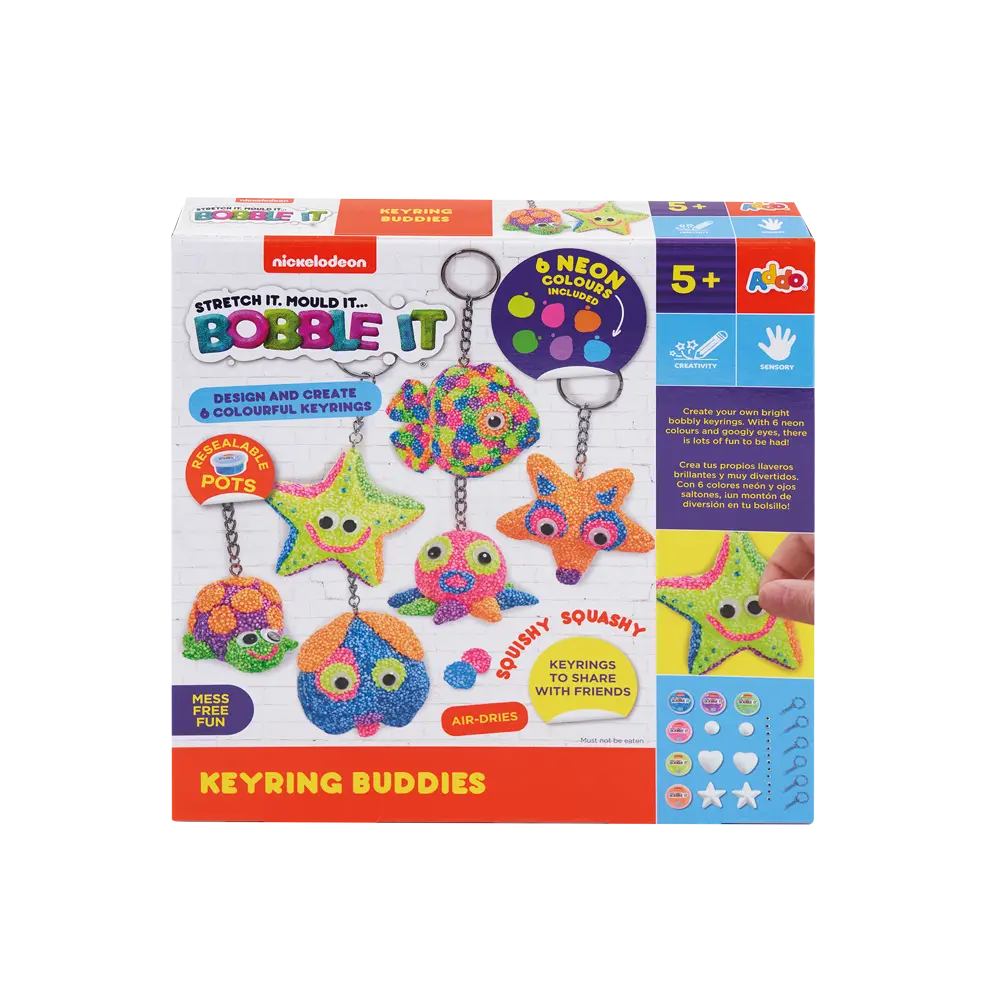 Stretch it, mould it, Bobble It! Get creative on the go with the Bobble It Keyring Buddies Craft Set. Use 6 vibrant neon colours to design and decorate fun, bobbly keyrings, then add googly eyes for extra personality. Once complete, attach to your bag, keys, or zippers for a playful accessory.
