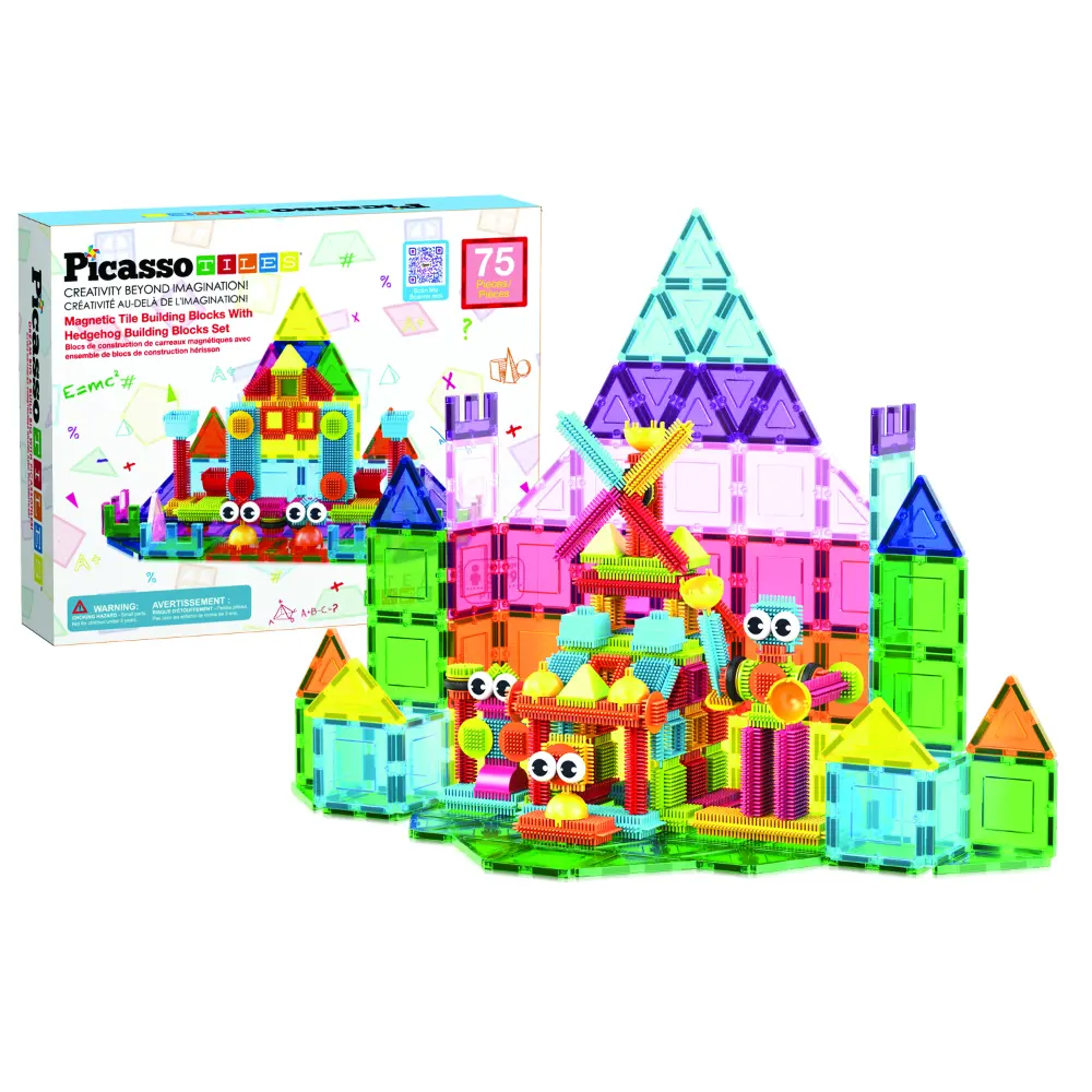 PicassoTiles 75 pieces magnetic tiles and soft hedgehog interlocking building block toy set (SKU: PTE21) is a dynamic developmental toy merging magnet tiles and soft connecting hedgehog toy pieces for creativity. With 34 magnet tiles, 35 soft hedgehog pieces, and 6 accessories, this soft building block set for toddlers and kids inspires imaginative play in classrooms and at home. Ideal for ages 3 and up, encouraging creativity and learning through hands-on exploration.