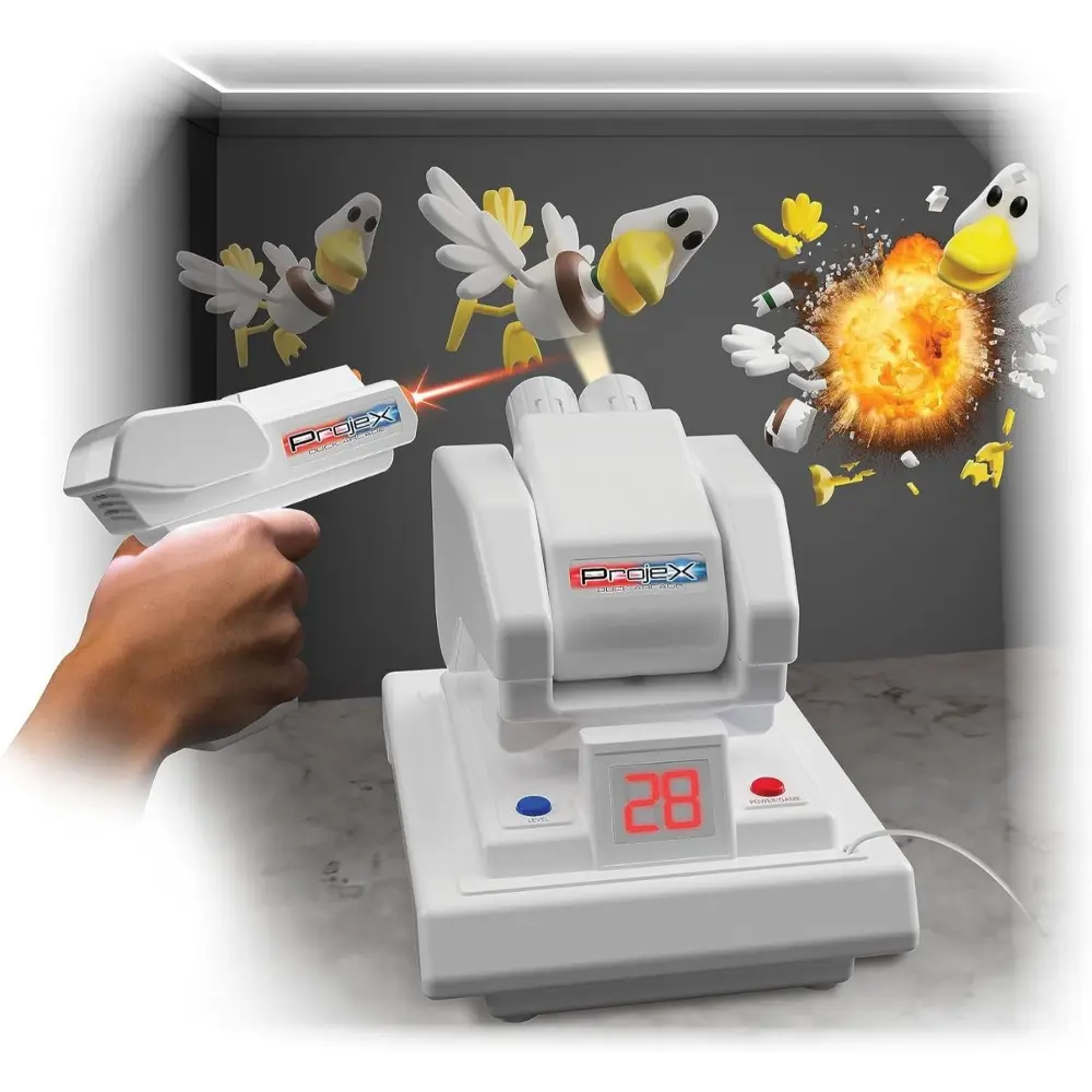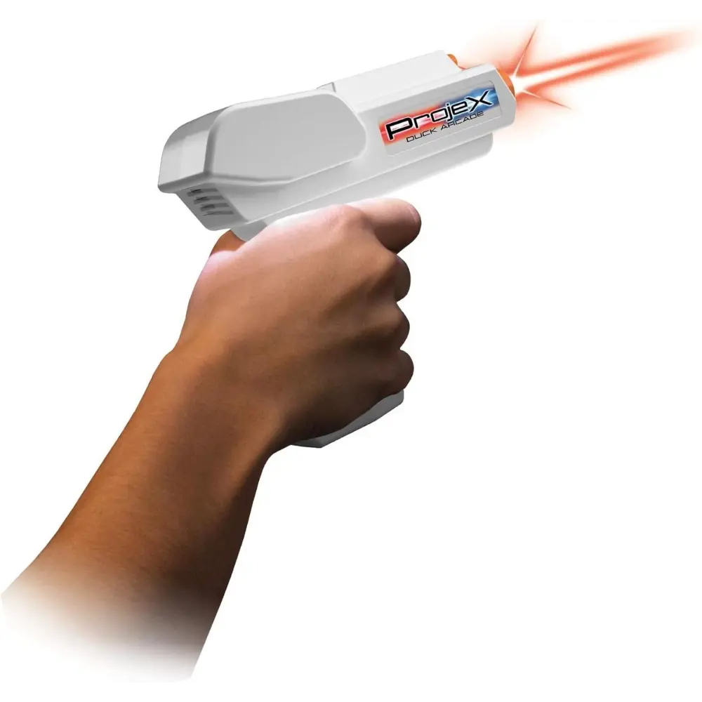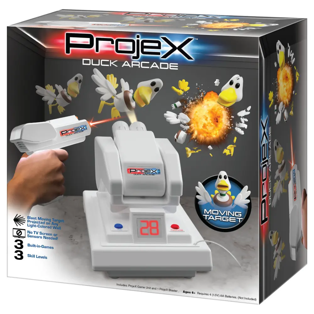 When it is lights off, its game on with the ProjeX Duck Arcade Game. No TV screens or sensors necessary. Just point ProjeX at a blank wall, grab the blaster, aim, and blast the targets! ProjeX lets you test your speed and skill as you blast the moving animated duck targets that it projects right onto your wall! There are three different built-in games and 3 skill levels from beginner to advanced and expert.