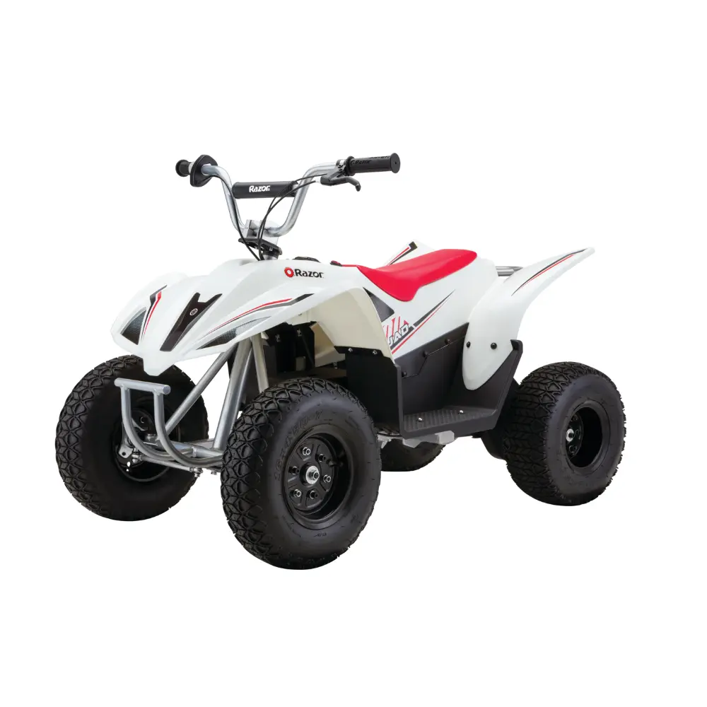 Step up your off-road adventures with the Razor Dirt Quad 500! Designed for older riders, this grown-up quad features authentic moto styling, a larger frame, and a high-torque 500W motor with self-adjusting chain for thrilling four-wheel power. Built to handle rugged terrain, the Dirt Quad 500 boasts a durable powder-coated steel frame, fully active rear suspension for traction, adjustable handlebars, and shatter-resistant plastic fairings. With variable-speed twist-grip throttle, hand-operated rear disc brake, and up to 60 minutes of continuous run time, it’s the ultimate quad for adrenaline-fueled fun.