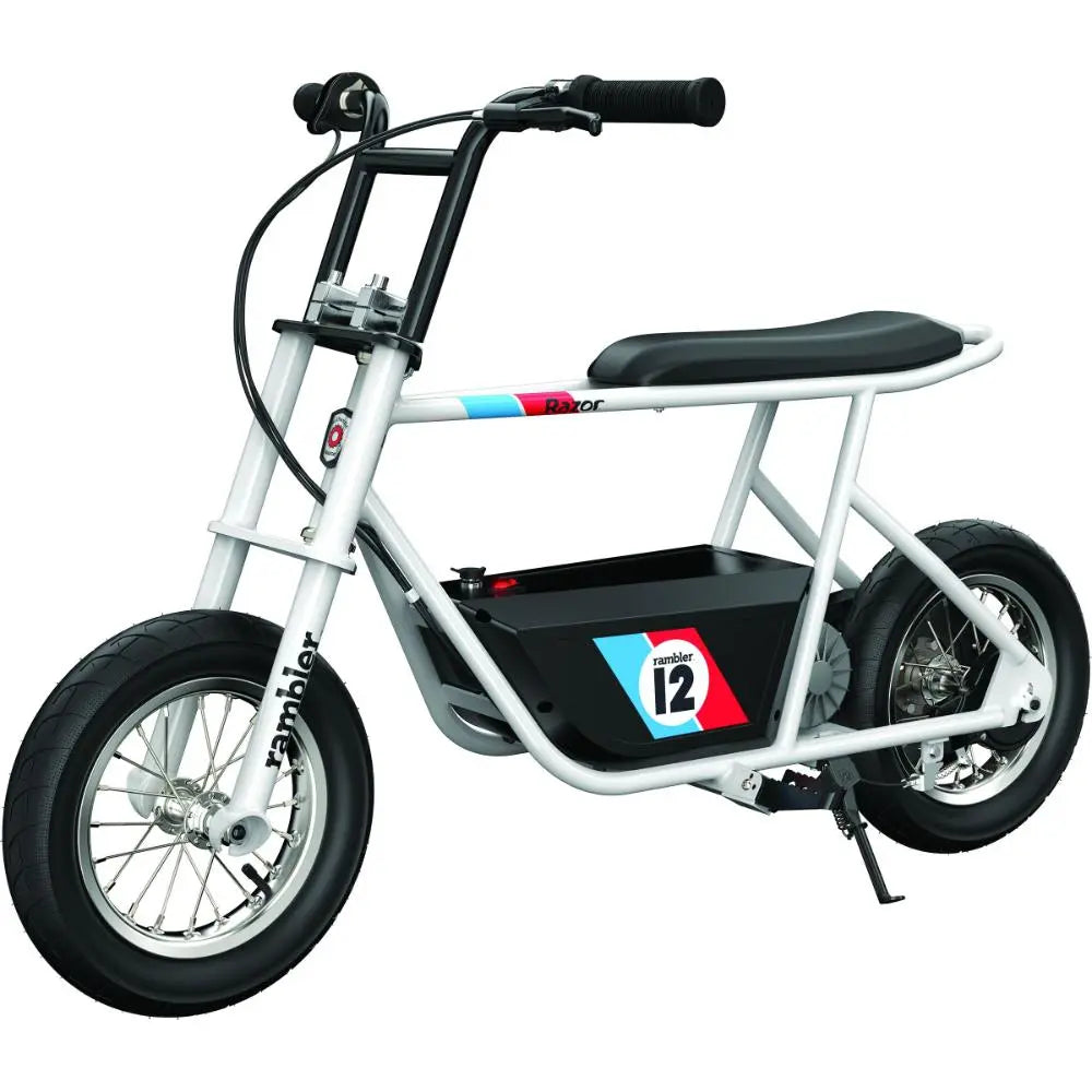 Get ready to ride in style with the Razor Rambler 12, the perfect retro-inspired electric minibike for teenage riders. Built with a high-torque 250-watt motor and a 24V rechargeable battery, this stylish minibike reaches speeds up to 14 mph (23 km/h) and offers up to 40 minutes of continuous ride time. The Rambler 12 features super-wide 12" (305 mm) pneumatic tires that handle rough terrain with ease, a comfortable banana-style seat, and riser-style handlebars for a smooth, top-of-the-line riding experience. Crafted with a durable steel frame and spoked wheels, this electric minibike combines classic style with modern performance, making it the ultimate ride for teens ready to cruise the streets in comfort and style.