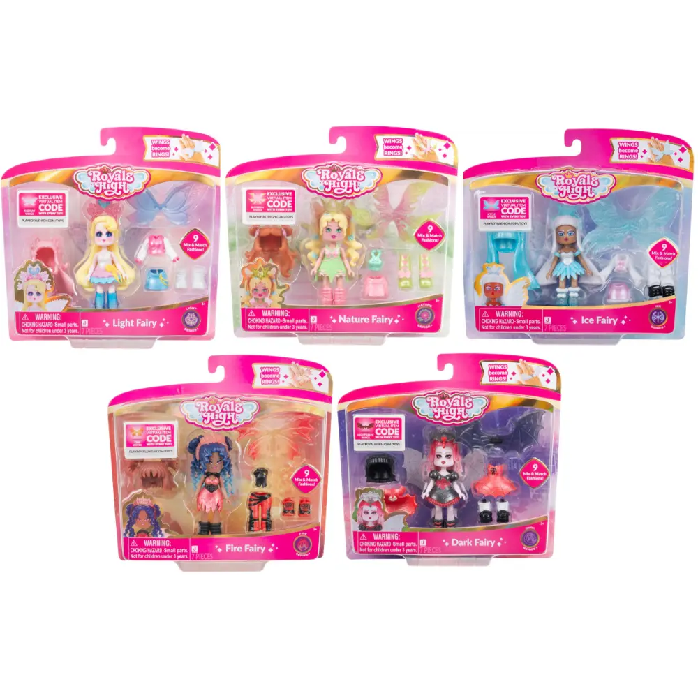 Welcome to the enchanting world of Royale High! As the biggest fashion-based property in gaming, Royale High invites you to explore a virtual world brimming with fashion and style. The 3-inch game-inspired dolls come with nine mix-and-match fashions and the fairy wings become a wearable ring! Five Series 1 fairies each represent an Element, including Dark, Ice, Fire, Light, and Nature. Each doll has a redeemable UGC game code to accessorize your fairy across all experiences. Officially licensed.