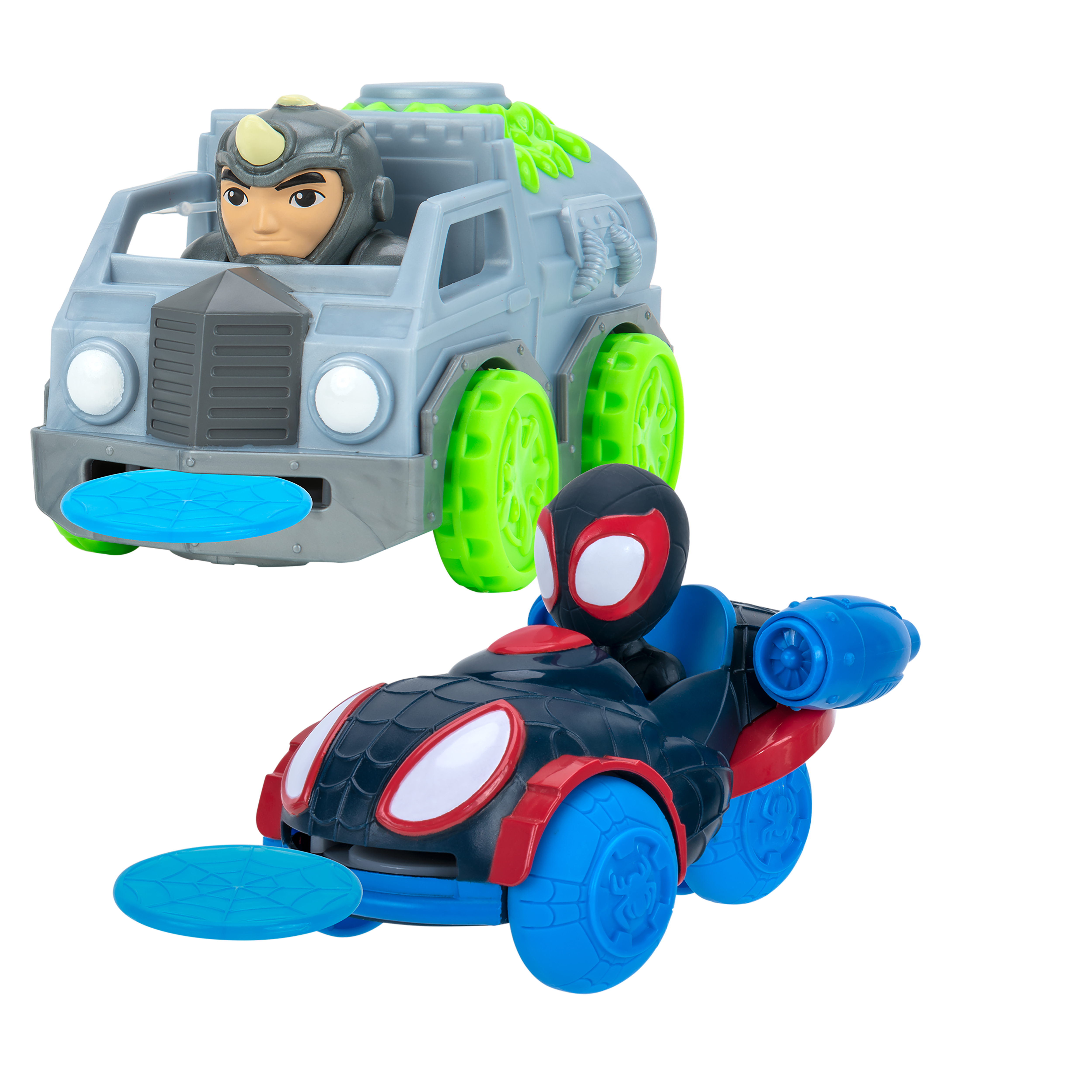 Bring Spidey action to life with the Disc Dasher 2-Pack! This set includes 5-inch freewheeling vehicles featuring Miles Morales and Rhino. Each Disc Dasher launches a disc by pressing down on the character’s head, and the discs can be conveniently stored in the vehicle’s hood for on-the-go battles. Perfect for spinning into action, these vehicles let kids dash around the city like their favorite superheroes. GO-WEBS-GO!